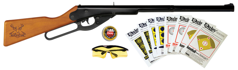 The Daisy Buck 105 is a .177 BB lever-action air rifle with a 16-inch barrel that achieves 350 feet per second. This shooting kit includes safety glasses, targets, and 750 BBs. The rifle features a stained hardwood stock and matte black metal finish with fixed open rear and blade ramp front sights.