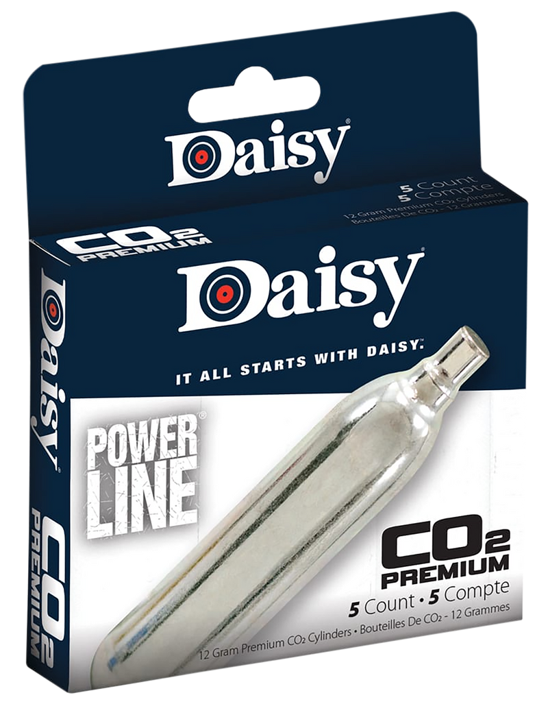 Pack of 5 twelve-gram CO2 cylinders designed for Daisy Powerline air rifles and pistols. These cartridges provide the pressurized gas necessary to power CO2-dependent airguns. Ground shipping only due to hazmat classification.