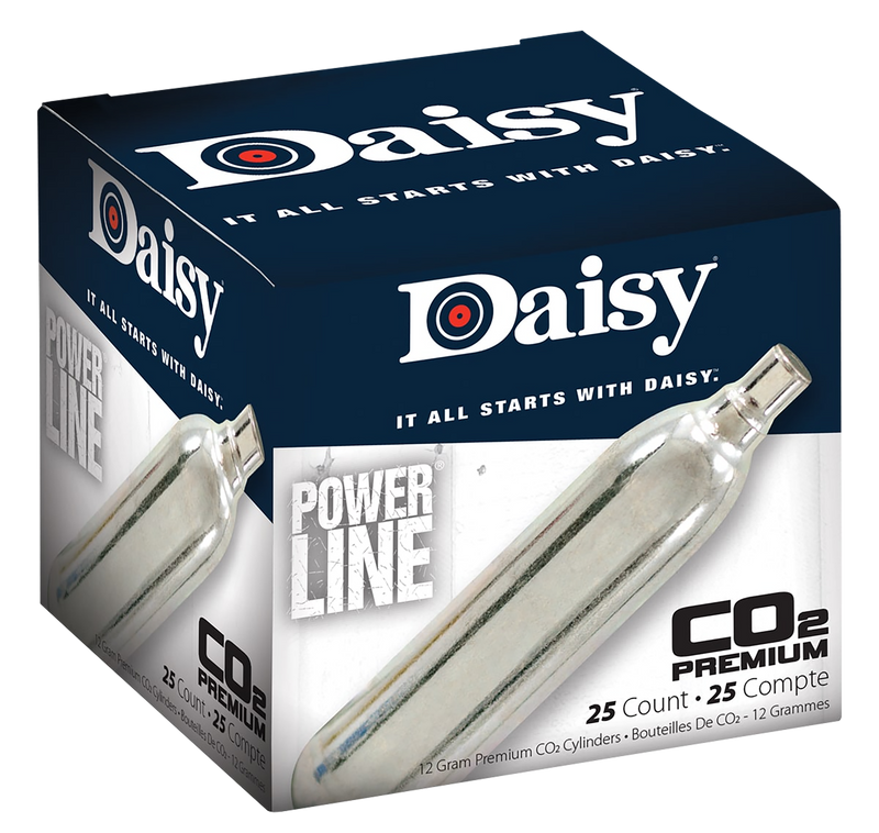 Pack of 25 twelve-gram CO2 cartridges designed for Daisy Powerline air guns and compatible airguns. These refill cylinders provide the necessary propellant for pneumatic airgun operation. Ground shipping only due to hazmat classification.