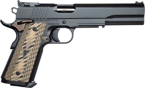 Semi-automatic 1911-style pistol chambered in 10mm Auto with a 5" match-grade stainless barrel and optics-ready slide. Features ambidextrous safety, fixed tritium night sights, Picatinny rail, G10 grips, and weighs 42.3 oz. Hand-fit construction ensures precision and reliability for defensive and sport shooting applications.