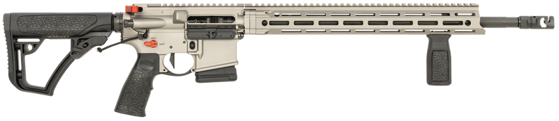 Semi-auto rifle chambered in 5.56 NATO with an 18" barrel and 10+1 capacity. Features a Geissele SD-3G single-stage trigger, Daniel Defense Soft Touch overmolded stock and grip, M-LOK rail system, and threaded barrel. California-compliant with 7.4 lbs weight and 34.75"-37.88" overall length.