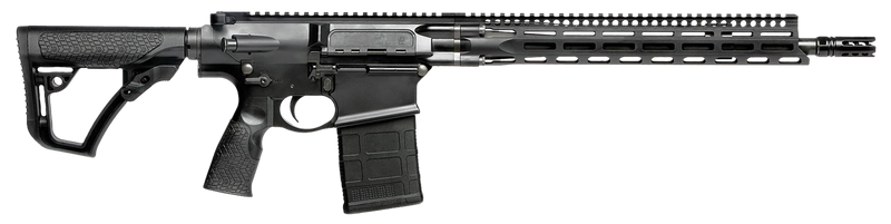 Semi-auto rifle chambered in 7.62x51mm NATO with a 16" hammer-forged barrel and 1:11" twist rate. Features a 7075-T6 aluminum receiver, optic-ready upper, adjustable intermediate gas system, and 6-position collapsible stock with SoftTouch overmolding. California-compliant with 10+1 capacity, weighs 8.3 lbs, and includes a DD Superior Suppression Device and full-latch impact plastic case.