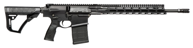 Semi-automatic rifle chambered in 7.62x51mm NATO (.308 Win) with an 18" threaded barrel and 1:11" twist rate. Features a machined 7075-T6 aluminum receiver, adjustable collapsible stock, Daniel Defense pistol grip, and 15" M-Lok rail system with upgraded BCG and adjustable intermediate gas system. Weighs 8.6 lbs and ships without magazine; includes hard-case protection.