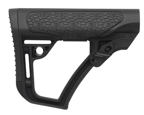 Daniel Defense OEM collapsible buttstock designed for AR-Platform rifles with mil-spec receiver extension. Constructed from glass reinforced polymer with a Tornado Gray finish, it features 6 positions of adjustment and measures 7.7" in length. The stock provides tactical customization without requiring a tube installation.