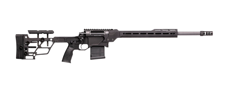 The Delta 5 Pro is a bolt-action rifle chambered in .308 Winchester with a 20" cold hammer-forged heavy Palma barrel and 1:10 twist rate. Features include a Timney Elite Hunter trigger, adjustable stock with cheek piece and LOP adjustment, aluminum chassis with M-LOK, threaded muzzle (5/8x24), and comes with one 10-round AICS-pattern Magpul PMAG. Guaranteed to shoot 0.5 MOA or better; weighs 10.8 lbs and ships in a full-latch impact case.