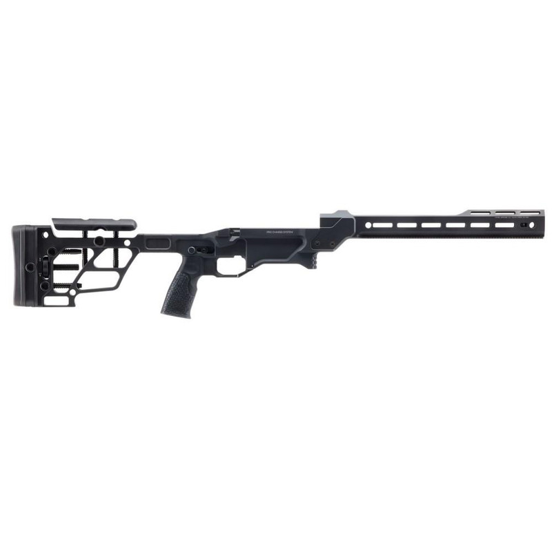 The Daniel Defense Pro Chassis System is a drop-in replacement chassis designed for Remington 700 bolt-action rifles and compatible R700 action platforms. Constructed from aluminum with an anodized finish, it features an integral ARCA rail, adjustable thumb rest, user-adjustable buttstock, and M-LOK compatibility for long-range competition use.