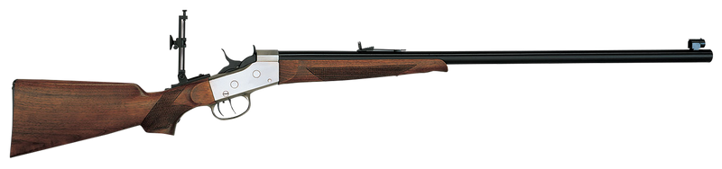 Single-shot break-action rifle chambered in 45-70 Gov with a 30" blued round steel barrel and 1:18" twist rate. Features a blued steel receiver, fixed walnut stock, and double-set trigger. Weighs 9.25 lbs with an overall length of 46.06".