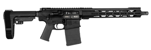 Semi-auto rifle chambered in .308 Winchester with a 13.5" 4150 CrMov medium barrel and muzzle brake. Features MOE K2+ grip, M-LOK S-rail handguard, and buffer tube. 20-round capacity.