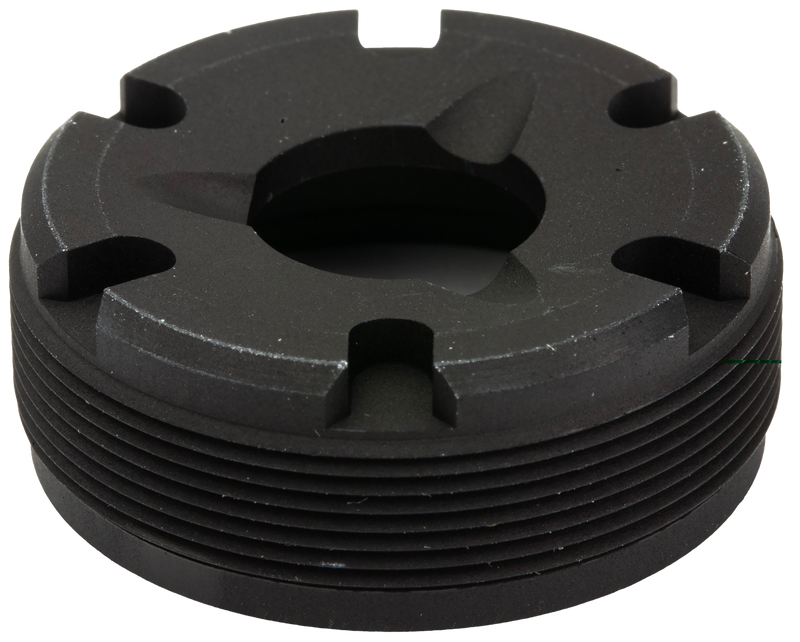 Front end cap replacement for the Dead Air Ghost 45 suppressor. Made of steel in black finish, this non-wipe cap is a direct factory replacement for the Ghost 45M, allowing easy field replacement without suppressor repair shipping. Dimensions approximately 4.75" length x 4.4" width x 0.6" height.