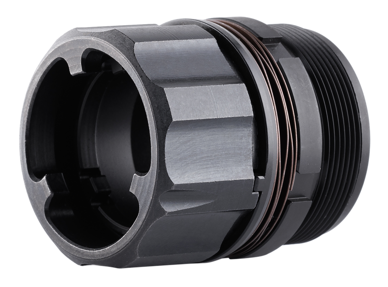 The Dead Air DA428 Key-Mo Adapter is a mounting interface designed to connect Key-Mo compatible muzzle devices to HUB socket silencers. Constructed from steel with a Cerakote Nitride finish, this adapter enables quick-disconnect mounting for Dead Air Omega and compatible silencers using the 1 3/8-24 thread pitch.
