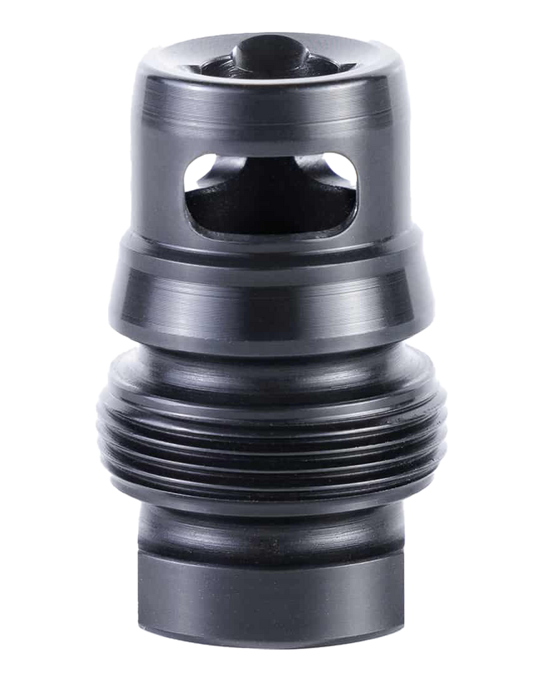 The Xeno Pistol Wee Brake is a compact muzzle brake designed for 9mm pistol caliber sub-guns with M13.5x1 LH threads. Constructed from steel with a nitride finish, it features a quick-detach mounting option compatible with Dead Air suppressors including the Wolfman, Ghost, Primal, Nomad, and Sierra-5. The shortened length and lightweight profile make it ideal for suppressor-equipped firearms.