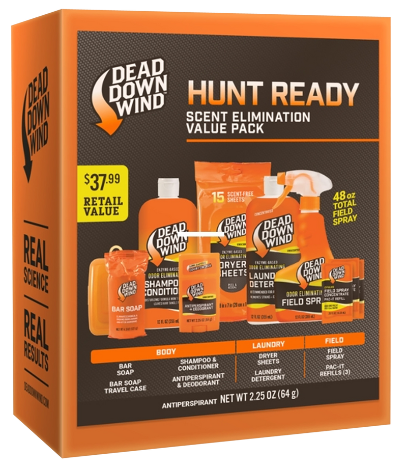 The Dead Down Wind Hunt Ready Kit is a 10-piece odor elimination system designed to reduce human scent during hunting. This unscented formula helps hunters minimize their odor signature in the field. The kit comes in a compact package sized 9.2" x 7.1" x 4.4".