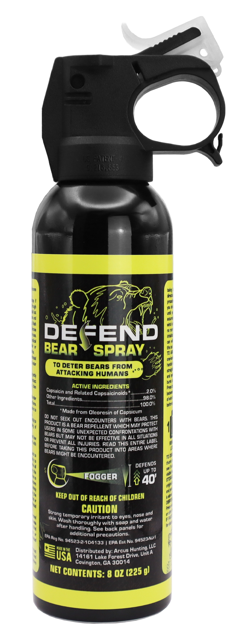 This bear spray aerosol delivers capsaicinoids with a 40-foot effective range and 2% active ingredient strength. Designed to repel bears and mountain lions, it comes in an 8 oz canister suitable for outdoor protection.