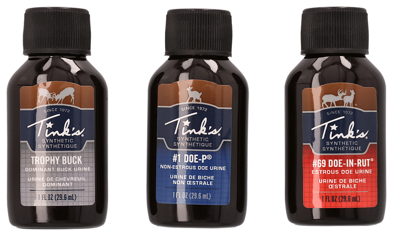 This three-piece synthetic deer attractant kit includes Doe-In-Rut, Doe-P, and Trophy Buck scents designed to attract deer during hunting season. Each 1 oz bottle features a convenient bottle dispenser for easy application in the field. The synthetic formulation provides consistent performance without natural product variability.