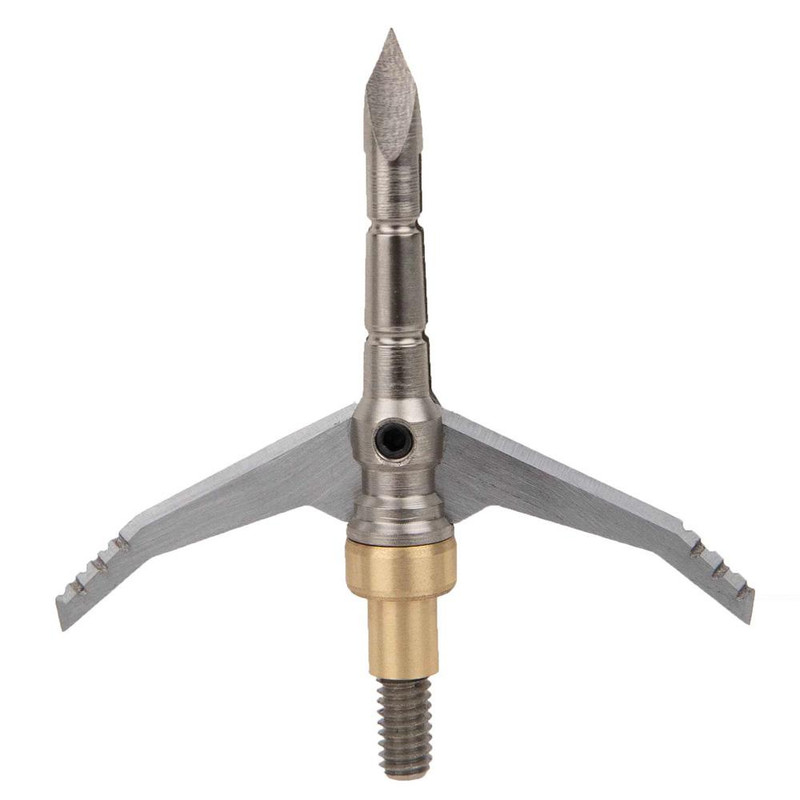 The Just Nasty 2.0 is a hybrid broadhead featuring adjustable speed grooves designed for fast vertical bows and crossbows. It has a carbon steel ferrule with a 3/4" entrance wound and 2" exit wound for maximum cutting diameter, and delivers field-tip accuracy with strong blood trail characteristics.
