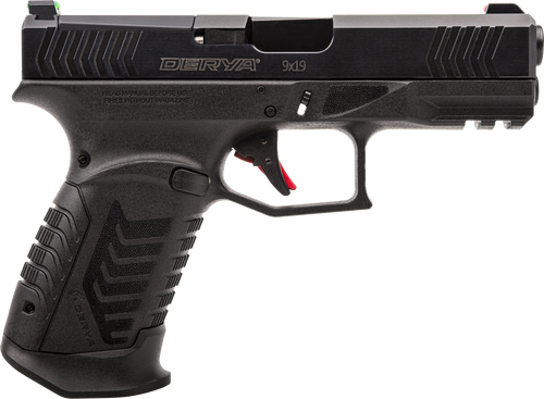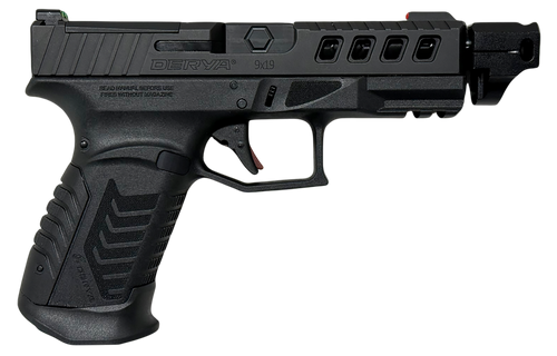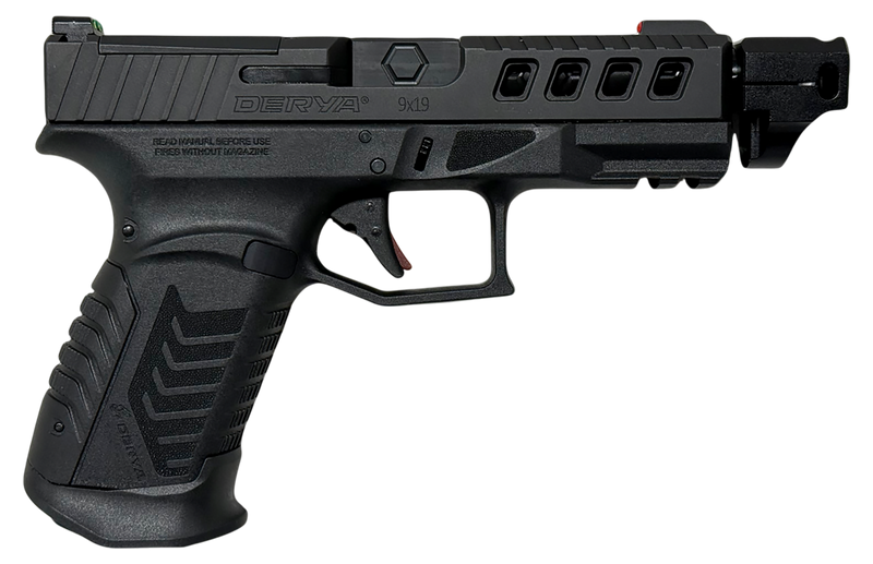 The Derya DY9 Comp is a striker-fired semi-automatic 9mm pistol with a 4.64-inch threaded compensated barrel and 15+1 round capacity. Features an optic-ready slide, TruGlo fiber optic sights, polymer frame with interchangeable backstraps, and includes two optic mounting plates. Glock magazine compatible with Melonite finish.