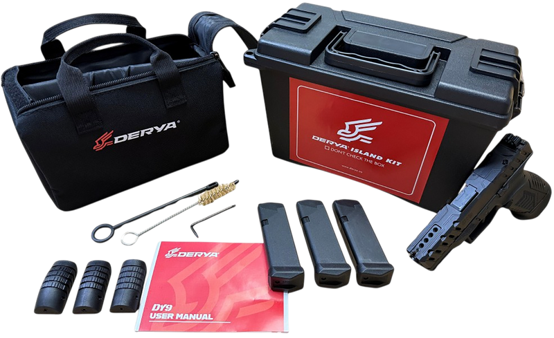 The Derya DY9 Island is a striker-fired, semi-automatic 9mm pistol with a 3.86" ported barrel and optic-ready slide featuring an RMR footprint. It includes TruGlo fiber optic sights, a polymer frame, and ships with three 15-round magazines. The compensated barrel design reduces muzzle rise for faster follow-up shots.