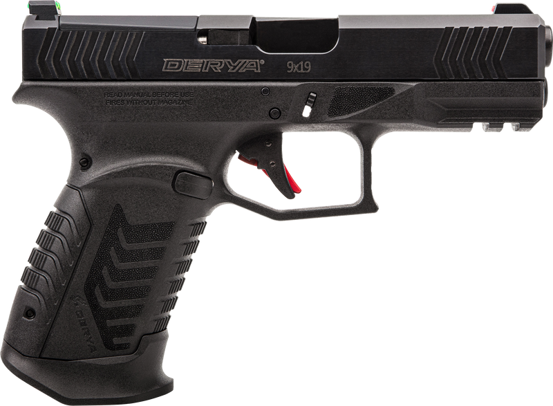 The Derya DY9 is a striker-fired semi-automatic pistol chambered in 9mm Luger with a 3.86" barrel and 15+1 round capacity. The optics-ready slide features serrated edges and is compatible with multiple optic mounting plates, while the polymer frame includes an accessory rail and four interchangeable backstraps for customizable grip fit. Includes TruGlo fiber optic sights, one magazine, and comes in a black Melonite finish.