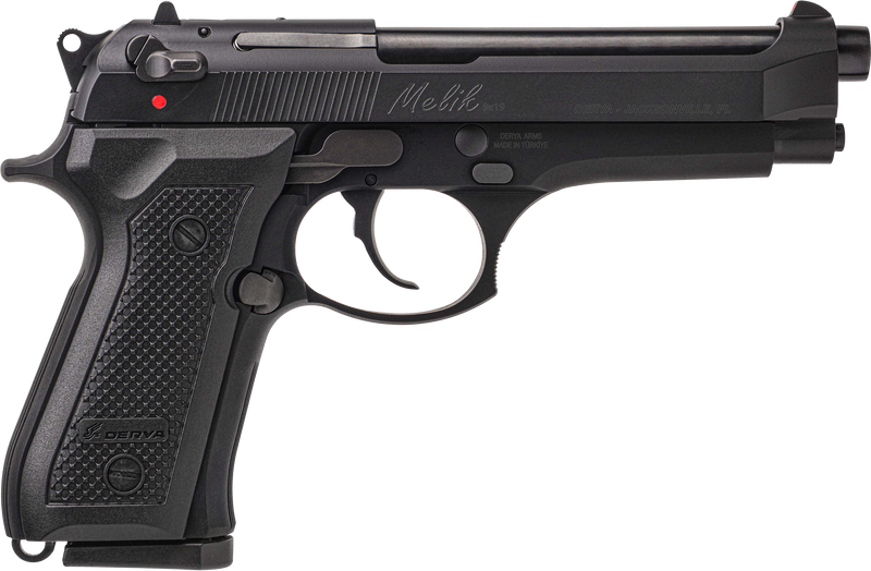 The Derya Melik is a 9mm semi-automatic pistol with double/single action mechanism, featuring a 4.9-inch barrel and 17+1 round capacity. It combines a black melonite steel slide with a black aluminum frame and fixed sights for reliability in recreational and defensive applications. This full-size pistol includes black polymer grips and comes with one 17-round magazine.