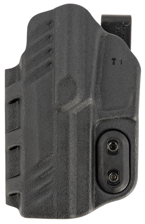 The Slim-Tuk is a minimal Inside Waistband (IWB) holster machined from Kydex material, designed for ambidextrous carry with a tuck-able 360 C-Clip that allows unlimited mounting options. It features adjustable tension, a rugged 1.75" nylon clip, and precision molding with reversible hardware for left or right-hand draw. This holster is specifically designed to fit the Glock 48 and Glock 48 MOS.