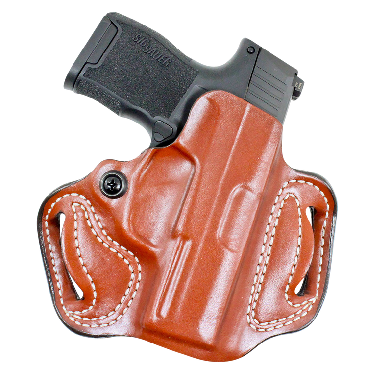 Outside-the-waistband (OWB) leather holster designed for the Sig P365, featuring a tan leather construction with right-hand draw. The belt slide mount accommodates 1.75" wide belts and measures 10.2" in length with a 1.5" height profile for compact carry.
