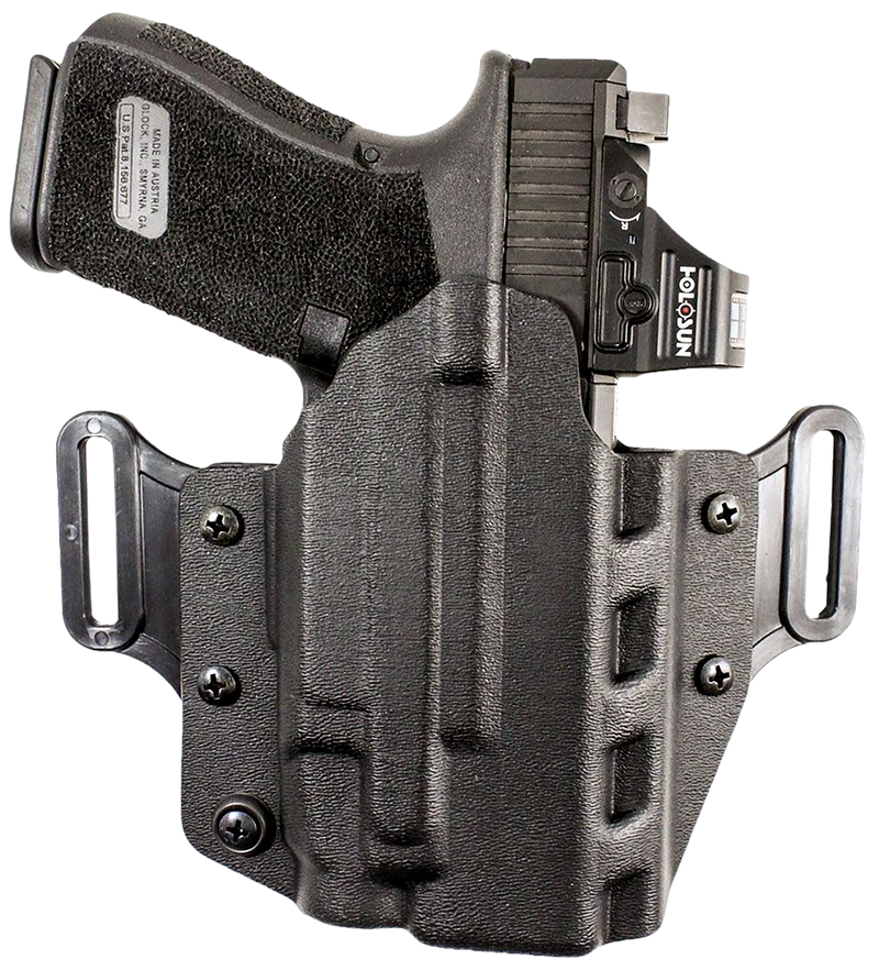 Outside-the-waistband (OWB) holster designed for Glock 19/23/32/45 pistols in black. Ambidextrous design allows wear on either side. Dimensions are 10.3" L x 8.6" W x 1.8" H.