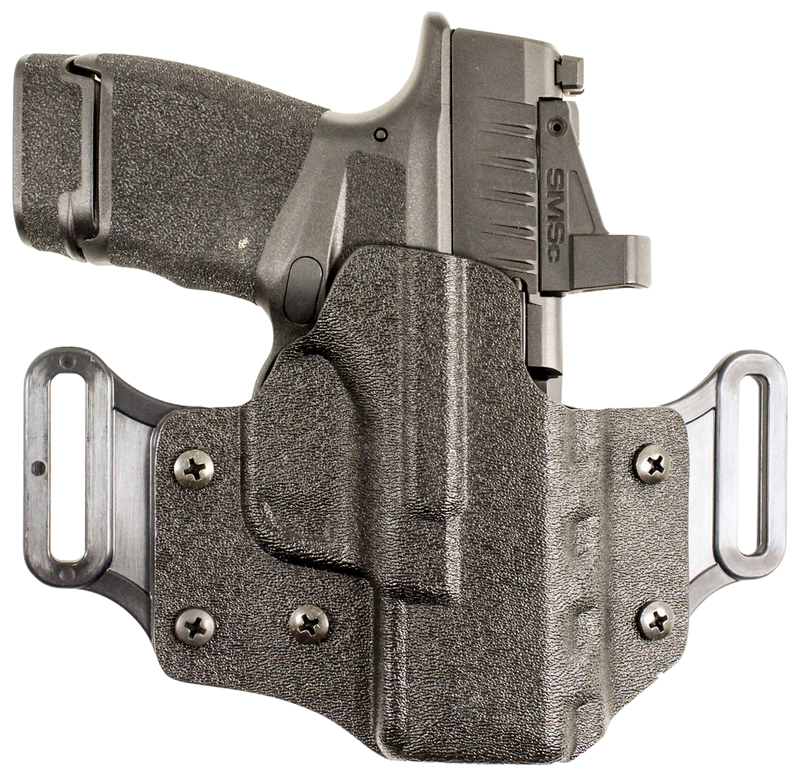 Outside-the-waistband belt slide holster constructed from Kydex material in black, designed to fit Springfield Prodigy pistols with or without red dot optics and 4.25-5" barrels. Right-hand draw configuration with a 1.6" width profile and 11.4" length for secure retention and comfortable all-day carry.