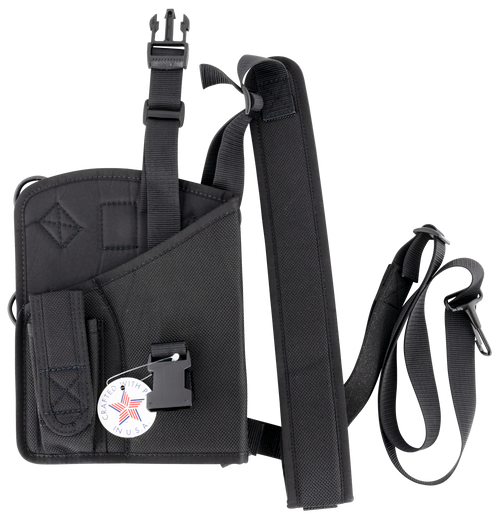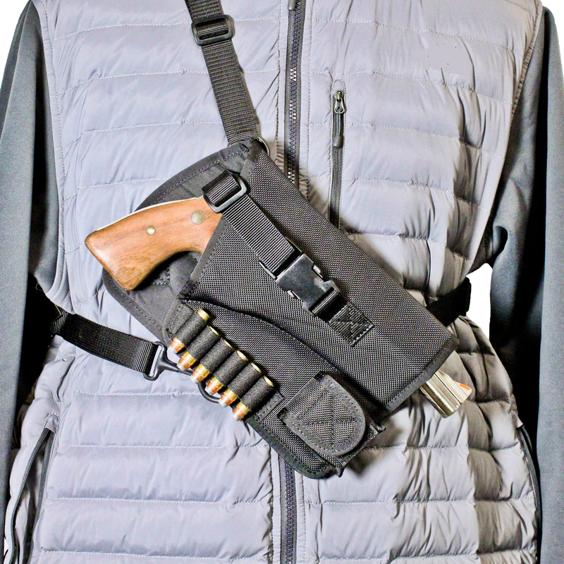 The Yukon Hunting Rig is a dual-compartment nylon shoulder holster designed for revolvers, specifically fitting the Ruger GP100 4" barrel. This right-hand carry system features a shoulder mount configuration with dimensions of 13.5" L x 7.5" W x 2.1" H, providing secure retention and comfortable all-day wear for hunters and field users.