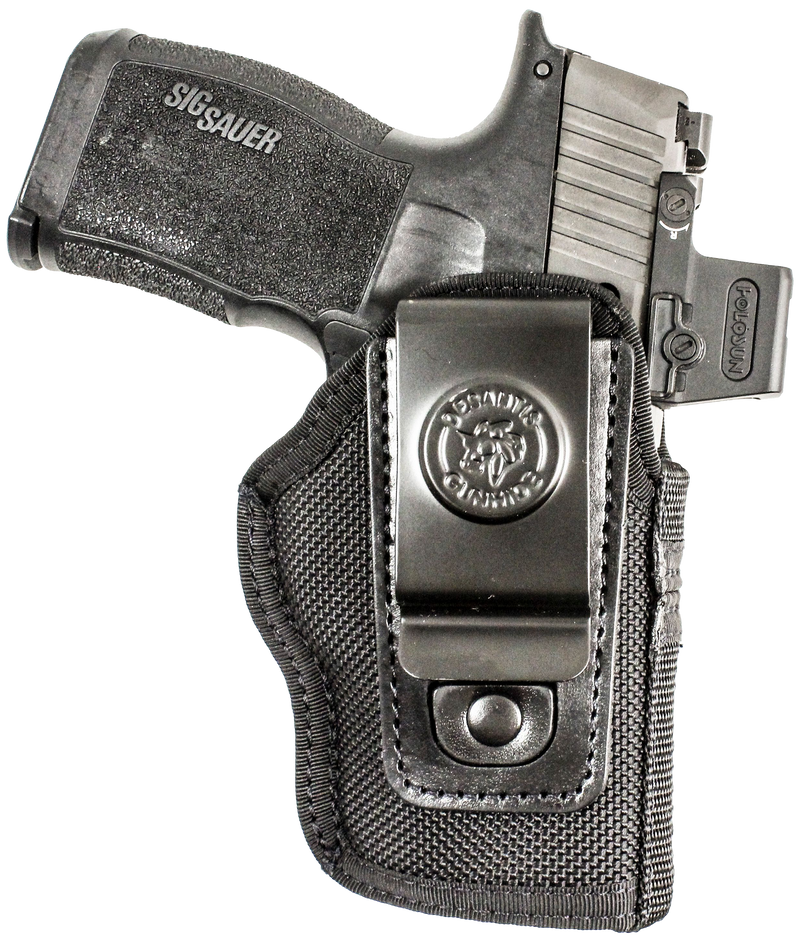 Inside-the-waistband nylon holster designed for Sig Sauer P365 pistols equipped with red dot sights. Ambidextrous design fits both left and right-hand shooters. Constructed from durable black nylon with dimensions of 8.0" length x 5.9" width x 1.5" height.