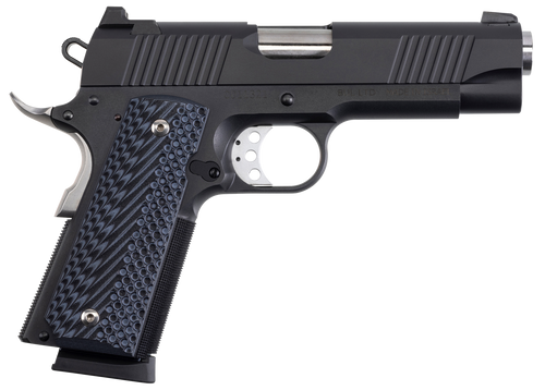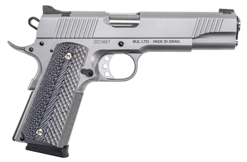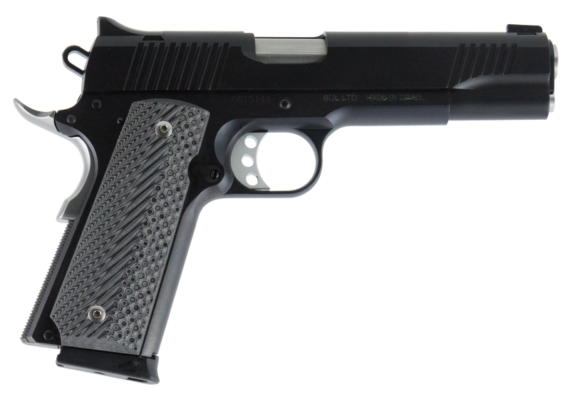 Single-action semi-auto pistol chambered in .45 ACP with a 5.01" barrel and 8+1 round capacity. Features a steel frame, matte black finish, G10 black/gray grips, skeletonized hammer, extended mag release, and fixed combat sights with dovetail front and adjustable rear. Weighs 36.2 oz with an overall length of 8.63".