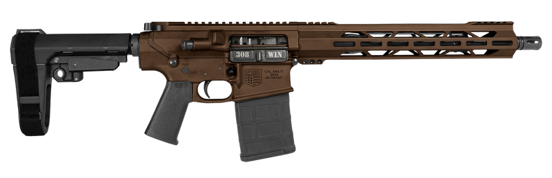 Semi-automatic AR pistol chambered in .308 Winchester with a 13.5" threaded barrel (5/8x24) and 20+1 round capacity. Features a forged 7075 T-6 aluminum upper and lower receiver, 13" M-LOK handguard, Magpul MOE K grip, and SB Tactical SBA3 brace. Weighs 5.1 lbs with an overall length of 30-32.5" and comes with one Magpul P-Mag.