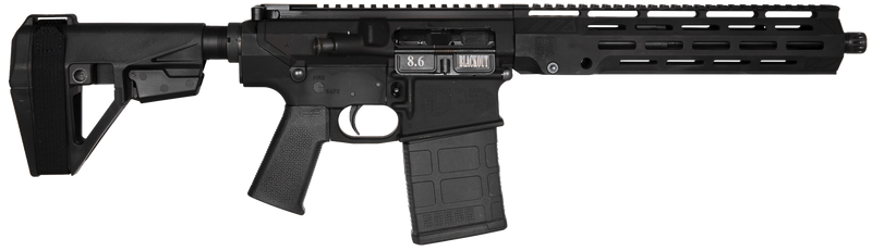 The Diamondback DB10 is a semi-automatic pistol chambered in 8.6 Blackout with a 12" 4150 Chrome Moly black nitride barrel and pistol-length direct impingement gas system. It features forged 7075 T-6 aluminum upper and lower receivers, an 11" M-LOK handguard with full Picatinny rail, Magpul MOE K grip, and SB Tactical SBA5 stabilizing brace. Weighing 7.2 lbs with an overall length of 28.5"-31", it comes with one 20-round Magpul P-Mag and has a threaded muzzle (5/8x24).