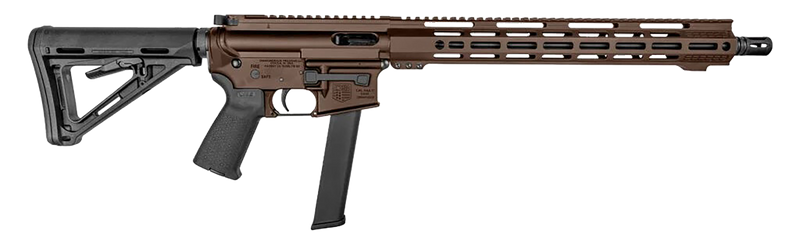 Semi-automatic rifle chambered in 9mm Luger with a 16" chromoly steel barrel and 32+1 capacity. Features a Midnight Bronze cerakote receiver, M-Lok handguard, Magpul CTR stock, and A2 flash hider. Weighs 6.8 lbs with no iron sights.