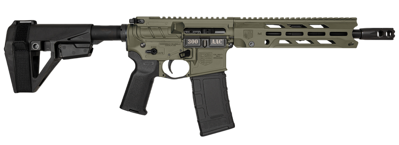 Semi-automatic AR pistol chambered in 300 AAC Blackout with a 10.5" threaded barrel (5/8x24) and 30+1 round capacity. Features a 9" M-LOK free-float rail, SB Tactical SBA5 pistol brace, Magpul MOE K2+ grip, and Obsidian muzzle brake. Weighs 6.25 lbs with an overall length adjustable from 24" to 29.5", finished in OD Green Cerakote with a forged aluminum receiver.