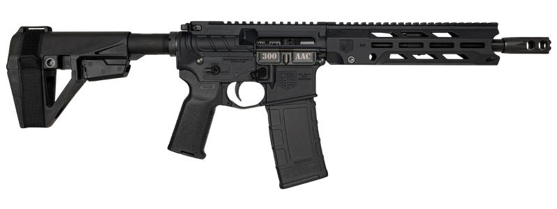 Semi-automatic AR pistol chambered in 300 AAC Blackout with a 10" heavy barrel, 1:8 twist, and 5/8x24 threaded muzzle brake. Features a 9" M-LOK rail, Magpul MOE K2 grip, SB Tactical SBA5 brace, and ships with one 30-round magazine. Weighs 6.25 lbs and measures 24" to 29.5" overall length with collapsible brace.
