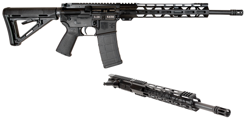 Semi-automatic AR-15 platform rifle chambered in 5.56 NATO with included 300 Blackout upper receiver, both featuring 16" barrels with A2 flash hiders. Equipped with 12" M-LOK handguard, Magpul MOE carbine stock and grip, forged aluminum receivers, and includes two 30-round magazines. Weighs 6.3-6.65 lbs with overall length of 32.5" to 35.75" depending on stock position.