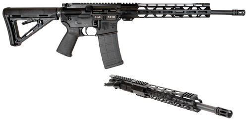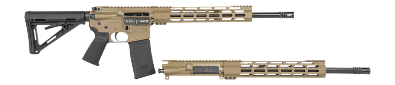 Semi-auto rifle chambered in 5.56 NATO and 300 Blackout with a 16" chromoly steel barrel and 30+1 capacity. Features FDE aluminum receiver, 12" M-LOK handguard, Magpul carbine stock and grip, A2 flash hider, and includes two interchangeable upper receivers. Overall length ranges from 32.5" to 35.75" and weighs 6.65 lbs.