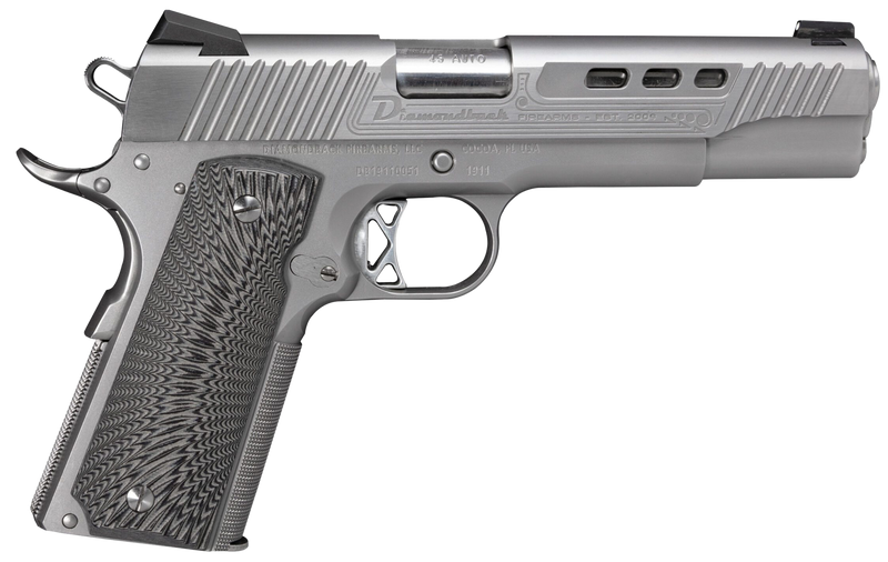 The Diamondback DB1911 is a single-action, semi-automatic 1911-style pistol chambered in 45 ACP with a 5" match-grade barrel and 8+1 capacity. It features a stainless steel ported slide with custom engraving, stainless steel frame, adjustable Novak sights, skeletonized aluminum trigger, and G10 composite grips. The pistol comes with three magazines and a Pelican 1200 case, and weighs 38 oz.