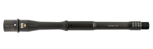 This is a 10.5" medium profile barrel chambered in 300 AAC Blackout with a 1:8 twist rate, designed to fit AR-15 platforms. It features a nitride finish, 5/8x24 thread pitch, and pistol-length gas system for reliable cycling with subsonic and supersonic ammunition.
