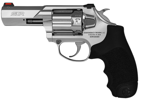 The Diamondback SDR is a double-action-only revolver chambered in .357 Magnum/.38 Special (+P) with a 2-inch barrel and 6-round capacity. Built from premium stainless steel with a polished finish, it features fiber-optic sights and a compact frame weighing just 21 ounces, making it ideal for concealed carry and personal defense.
