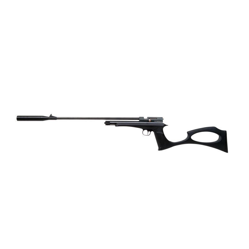 CO2-powered .177 caliber pellet air rifle with bolt-action and adjustable 2-stage trigger, delivering approximately 500 fps. Features fixed front and adjustable rear sights on 11mm dovetail, small Weaver mount, and includes soft case, pistol butt stock, and silenced barrel. Weighs 3.1 lbs with synthetic stock and rubberized butt plate.