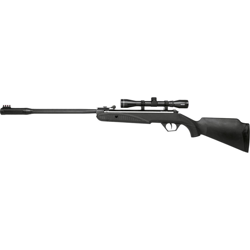 .177 caliber break-barrel spring-powered pellet air rifle with 16.5" rifled steel barrel and 575 fps velocity. Includes 4x32 scope, adjustable TRUGLO fiber optic sights, 11mm prism rail, and rubberized butt plate. Ambidextrous composite stock design, 6.2 lbs, suitable for entry-level shooters.
