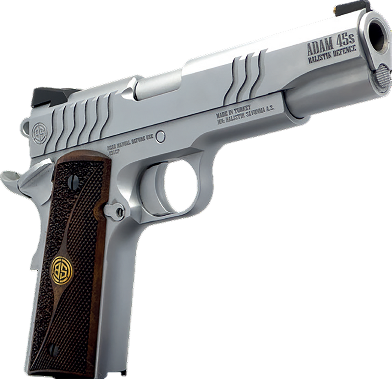 The Dickinson Adam S is a full-size 1911 chambered in 45 ACP with a 5" stainless button-rifled barrel and single-action trigger. Features a stainless steel frame and slide with S-style serrations, wood grips, and 7+1 round capacity. This is a traditionally-styled 1911 platform pistol built on forged steel construction.