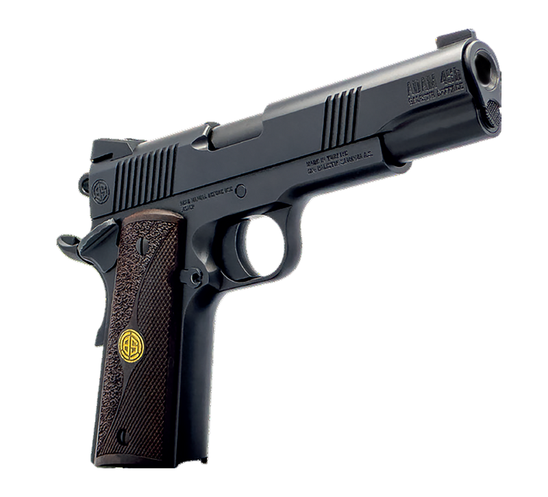 The Dickinson 1911 Adam is a full-size single-action-only pistol chambered in 45 ACP with a 4.37" barrel and 8+1 capacity. It features a matte black serrated aluminum slide, black steel frame, ambidextrous safety, and wood grips. Overall dimensions are 12.0" length × 9.0" width × 3.0" height.