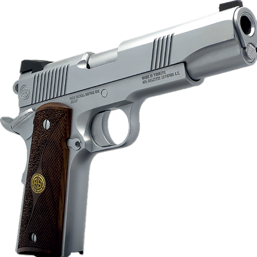 Single-action only 1911-style pistol chambered in 9mm Luger with a 4.37" black steel barrel and 8+1 capacity. Features a shiny black serrated aluminum slide paired with a steel frame and wood grips. Dimensions are 12.3" length × 3.1" height × 9.0" width.
