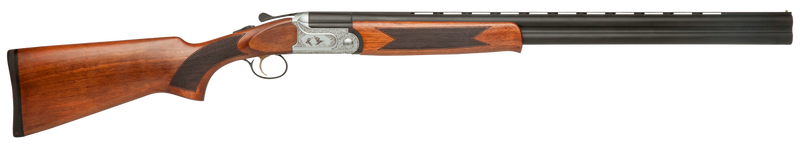 The Dickinson Green Wing is a 12 Gauge break-action shotgun with a 28" ventilated rib barrel and 3" chamber, chambered for 2 rounds. Features an engraved steel receiver with satin silver metal finish, wood stock, tang safety, and single-stage trigger. Weighs 6.83 lbs with adjustable MobilChoke configuration.