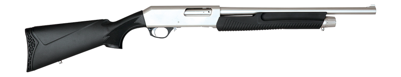 The Dickinson Commando Marine Tactical is a 12 gauge pump-action shotgun with a 3" chamber and 18.5" stainless steel barrel. It features a 5+1 round capacity with a fixed black synthetic stock, designed for tactical applications. Overall dimensions are 46.5" length with a stainless steel barrel and receiver for corrosion resistance.