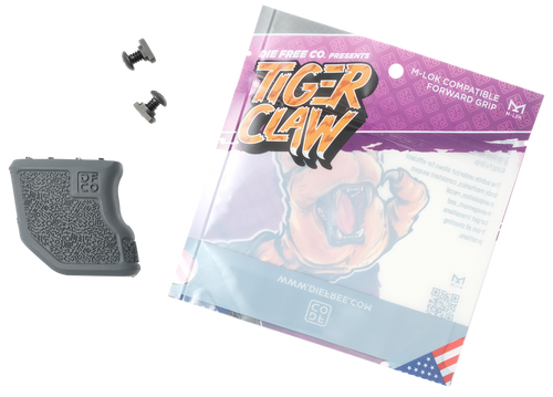 Die Free Co Tiger Claw is a nylon fore grip designed for M-LOK compatible rails with a 10-degree angle for ergonomic control. The grip measures 4.9" length by 4.9" width by 1.3" height and is constructed from durable nylon material in Olive Drab Green finish. This accessory installs directly to M-LOK slots on handguards and provides a secure, angled grip point for improved weapon handling.