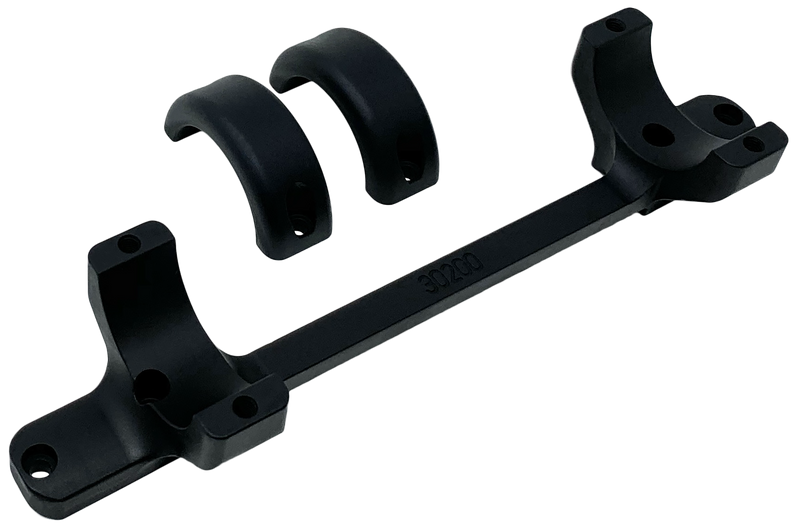 This is a one-piece scope mount and ring combo designed for Savage rifles, featuring a 30mm tube diameter. The mount is constructed from 6061-T6 aluminum in a matte black finish with medium height rings and a 1.05" mount height for receiver attachment.