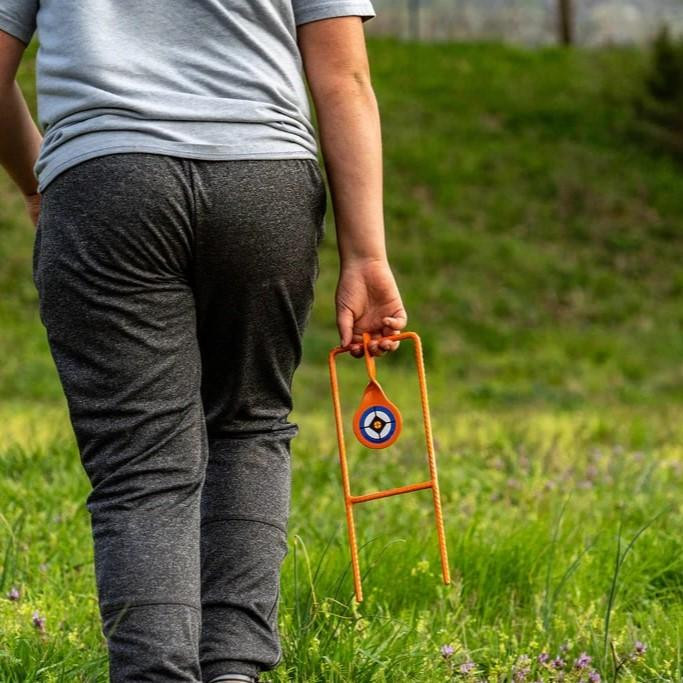 A durable steel and rebar construction spinner target designed for .22 caliber plinking. Features powder coat finish for corrosion resistance, requires no assembly, and is reusable for extended use. Simply stake into the ground and begin shooting.